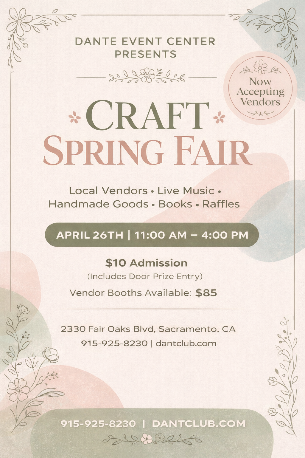 April 26th Spring Craft Fair is Here! Live Music | Local Vendors | Books | Raffles | Homemade Goods Drinks | Food $10 Per Person (Includes Door Prize entry!) Open to the Public! Bring your Friends & Family! Purchase Tickets Here!