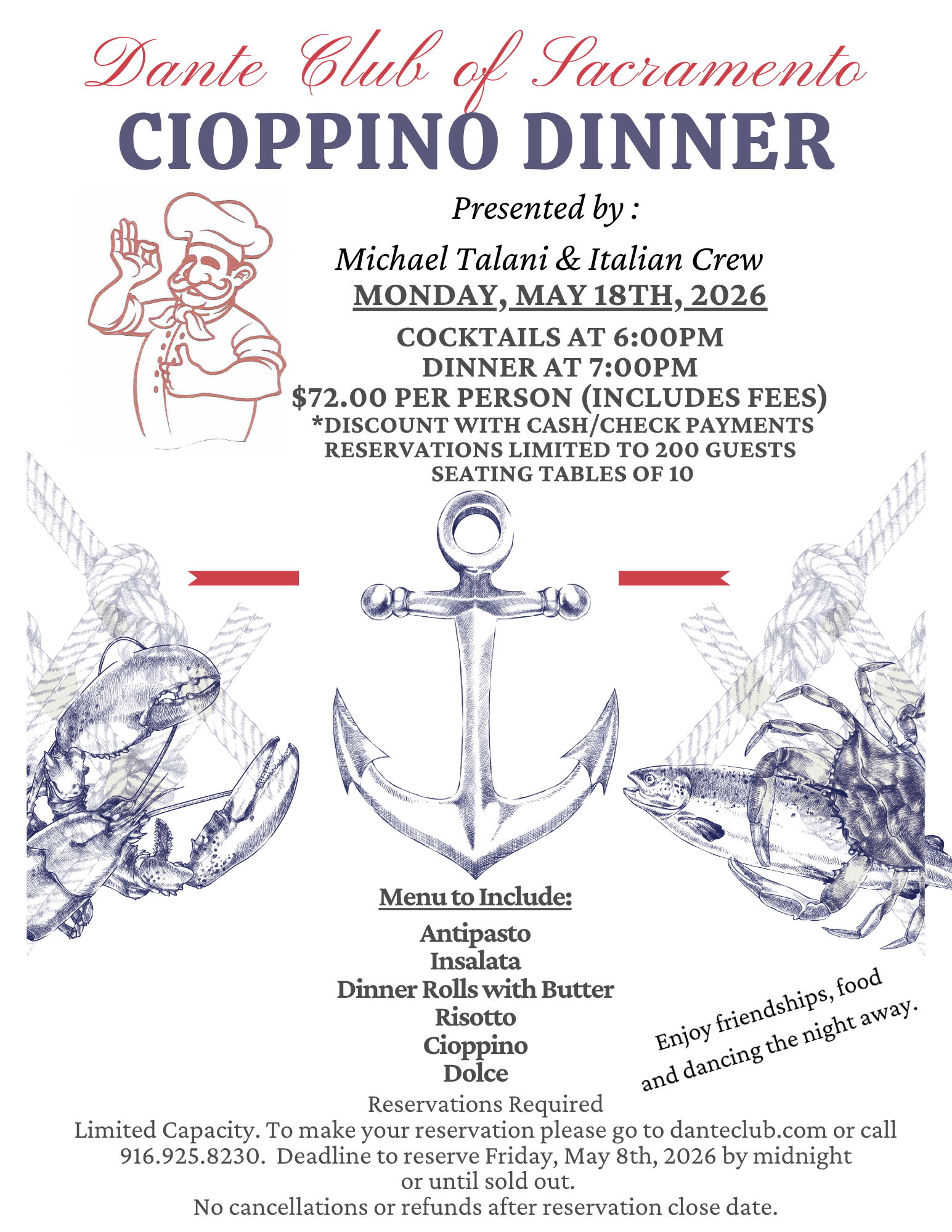 Reservations Required! Limited Capacity. To make your reservation please go to danteclub.com or call 916.925.8230. Deadline to reserve Friday, May 8th, 2026 by midnight or until sold out. No cancellations or refunds after reservation close date. All refund requests must be made in writing and requested by the original purchaser.
